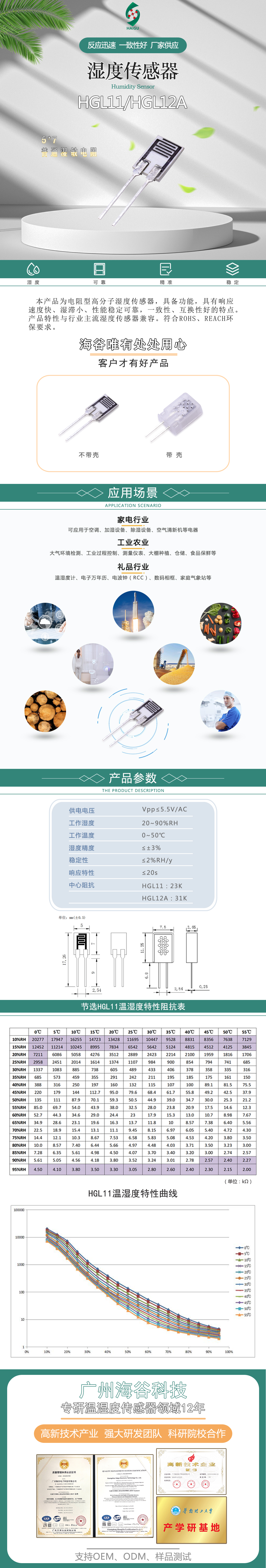 該產(chǎn)品為電阻型高分子濕度傳感器(HGL11/HGL12/HGL12A),性能穩(wěn)定可靠,產(chǎn)品一致性好,方便大批量生產(chǎn)。