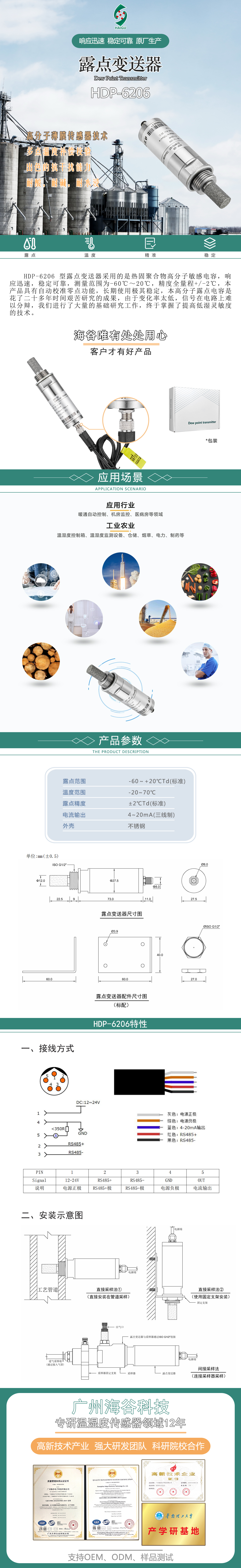 HDP-6206 型露點變送器采用的是熱固聚合物高分子敏感電容,響應迅速,穩(wěn)定可靠,測量范圍為-60℃~20℃,精度全量程±2℃,本產(chǎn)品具有自動校準零點功能,長期使用極其穩(wěn)定
