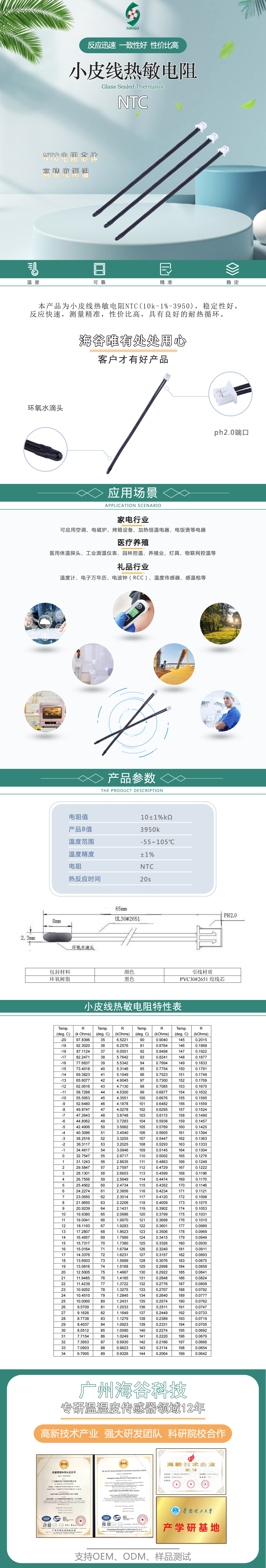 該產(chǎn)品為NTC小皮線熱敏電阻,穩(wěn)定性好,反應(yīng)快速,良好的耐熱循環(huán)。