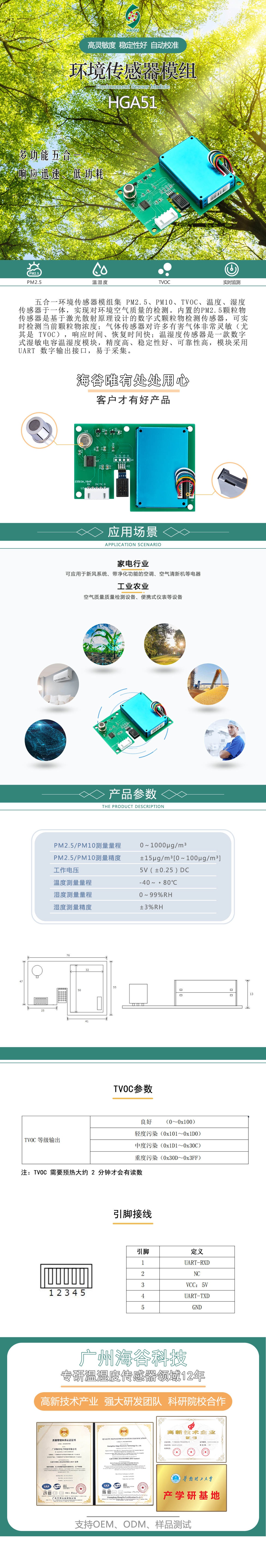 五合一環(huán)境傳感器模組集 PM2.5、PM10、TVOC、溫度、濕度傳感器于一體,實(shí)現(xiàn)對(duì)環(huán)境空氣質(zhì)量的檢測(cè)。