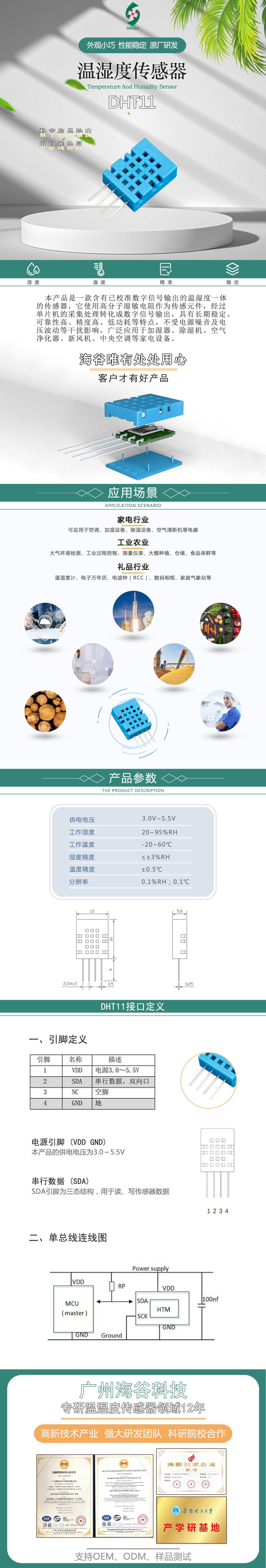 該產品為DHT11溫濕度模塊,外觀小巧,性能穩(wěn)定,一致性好。適用電子萬年歷、溫濕度儀表、數(shù)字相框、加濕設備、除濕設備、高檔空調等。